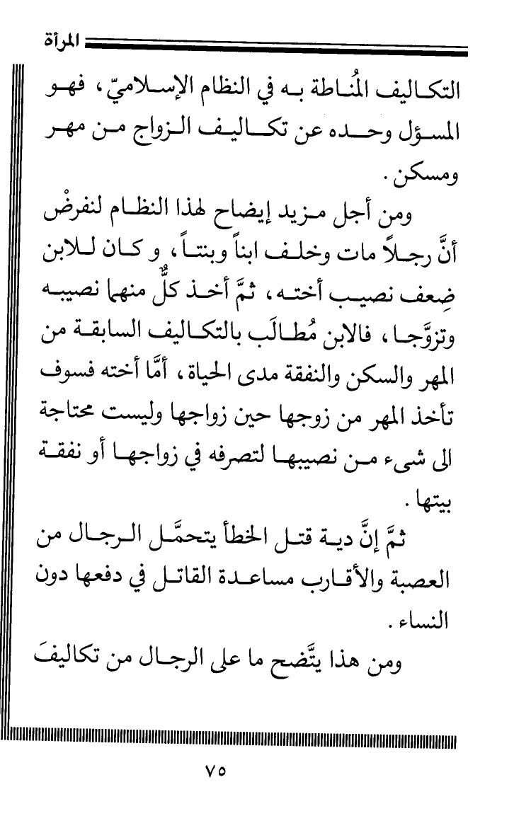 ومن أجل مزيد إيضاح لهذا النظام لنفرضْ أن رجلا مات وخلف ابنا وبنتا، وكان للابن ضِعف نصيب أخته، ثمَّ أخذ كل منهما نصيبه وتزوَّجا، فالابن مُطالَب بالتكاليف السابقة من المهر والسكن والنفقة مدى الحياة، أمَّا أخته فسوف تأخذ المهر من زوجها حين زواجها وليست محتاجة إلى شيء من نصيبها لتصرفه في زواجها أو نفقة بيتها.