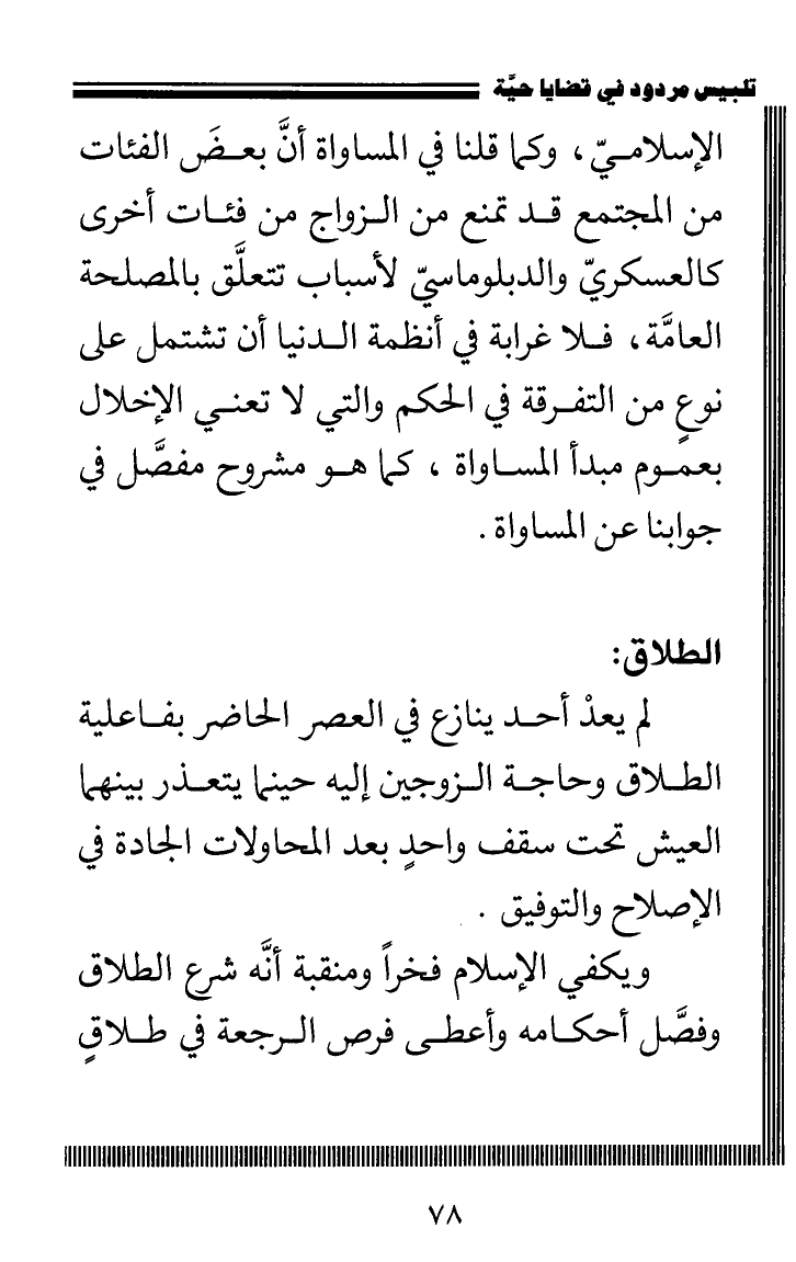 الطلاق لم يعدْ أحد ينازع في العصر الحاضر بفاعلية الطلاق وحاجة الزوجين إليه حينما يتعذر بينهما العيش تحت سقف واحدٍ بعد المحاولات الجادة في الإصلاح والتوفيق.