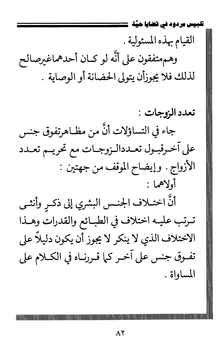 تعدد الزوجات جاء في التساؤلات أنَّ من مظاهر تفوق جنس على آخر قبول تعدد الزوجات مع تحريم تعدد الأزواج. وإيضاح الموقف من جهتين: