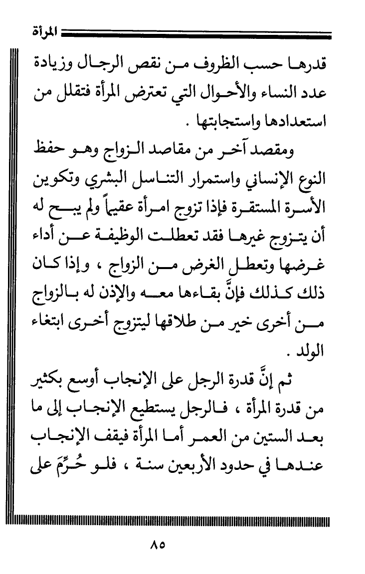 قدرها حسب الظروف من نقص الرجال وزيادة عدد النساء والأحوال التي تعترض المرأة فتقلل من استعدادها واستجابتها.
