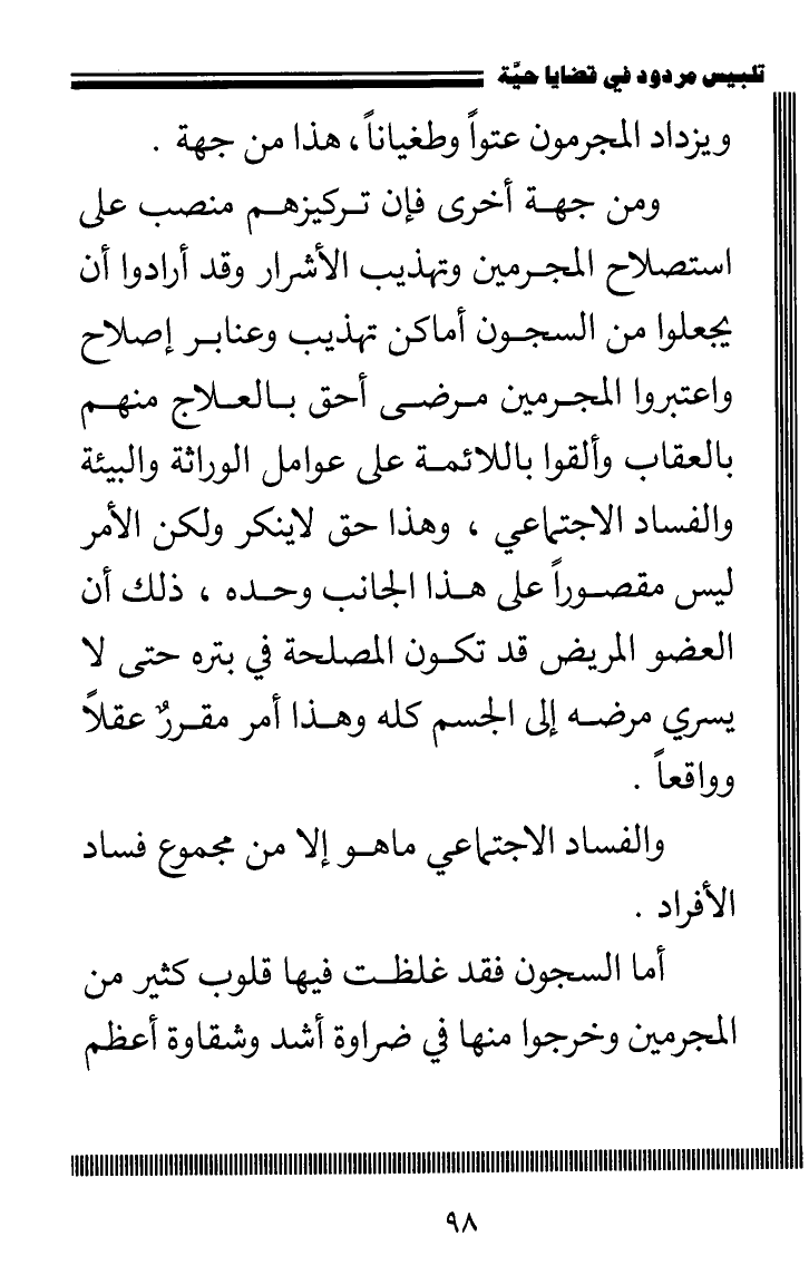 ومن جهة أخرى فإن تركيزهم منصب على استصلاح المجرمين وتهذيب الأشرار وقد أرادوا أن يجعلوا من السجون أماكن تهذيب وعنابر إصلاح واعتبروا المجرمين مرضى أحق بالعلاج منهم بالعقاب وألقوا باللائمة على عوامل الوراثة والبيئة والفساد الاجتماعي، وهذا حق لا ينكر ولكن الأمر ليس مقصورا على هذا الجانب وحده، ذلك أن العضو المريض قد تكون المصلحة في بتره حتى لا يسري مرضه إلى الجسم كله وهذا أمر مقرر عقلًا وواقعًا.