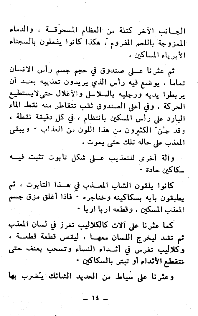 ثُمَّ عَثَرْنَا عَلَى صُنْدُوقٍ فِي حَجْمِ جِسْمِ رَأْسِ الإِنْسَانِ تَمَامًا، يُوضَعُ فِيهِ رَأْسُ الذِي يُرِيدُونَ تَعْذِيبَهُ بَعْدَ أَنْ يَرْبِطُوا يَدَيْهِ وَرِجْلَيْهِ بِالسَّلاَسِلِ وَالأَغْلاَلِ حَتَّى لاَ يَسْتَطِيعَ الحَرَكَةَ، وَفِي أَعْلَى الصُّنْدُوقِ ثُقْبٌ تَتَقَاطَرُ مِنْهُ نُقَطَ المَاءِ البَارِدِ عَلَى رَأْسِ المِسْكِينِ بِانْتِظَامٍ، فِي كُلِّ دَقِيقَةٍ نُقْطَةٌ، وَقَدْ جُنَّ الكَثِيرُونَ مِنْ هَذَا اللَّوْنِ مِنَ العَذَابِ، وَيَبْقَى المُعَذَّبُ عَلَى حَالِهِ تِلْكَ حَتَّى يَمُوتَ.