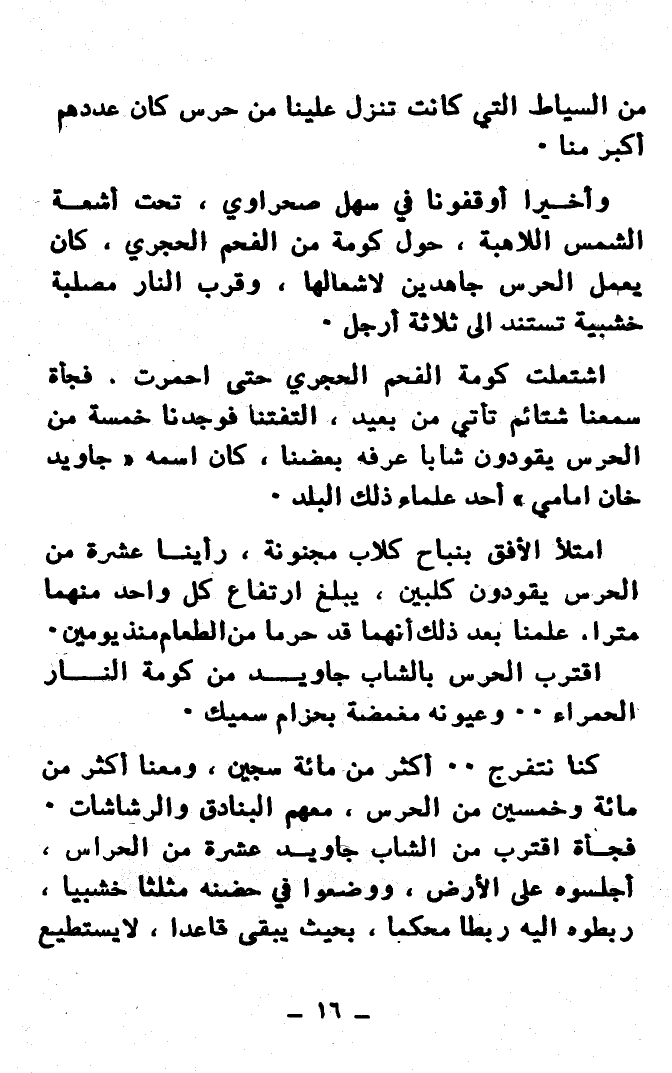 اِشْتَعَلَتْ كَوْمَةُ الفَحْمِ الحَجَرِيِّ حَتَّى اِحْمَرَّتْ، فَجْأَةً سَمِعْنَا شَتَائِمَ تَأْتِي مِنْ بَعِيدٍ، اِلْتَفَتْنَا فَوَجَدْنَا خَمْسَةً مِنَ الحَرَسِ يَقُودُونَ شَابًّا عَرَفَهُ بَعْضُنَا، كَانَ اسْمُهُ "جَاوِيدْ خَانْ إِمَامِي" أَحَدَ عُلَمَاءِ ذَلِكَ البَلَدِ.