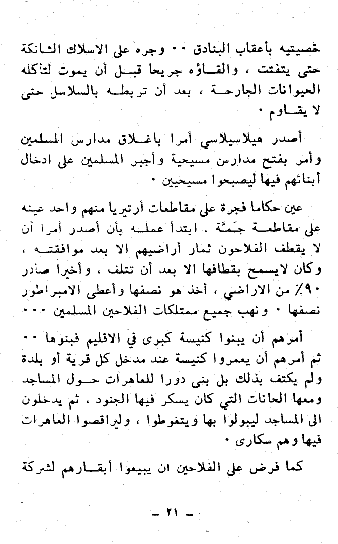 عَيَّنَ حُكَّامًا فجرة على مقاطعات أرتيريا منهم واحد عَيَّنَهُ على مقاطعة جَمَّة، ابتدأ عمله بأن أصدر أَمْرًا أن لا يقطف الفلاحون ثمار أراضيهم إلا بعد موافقته، وكان لا يسمح بقطافها إلا بعد أن تتلف، وأخيرًا صادر 90% من الأراضي، أخذ هو نصفها وأعطى الإمبراطور نصفها. ونهب جميع ممتلكات الفلاحين المسلمين ..