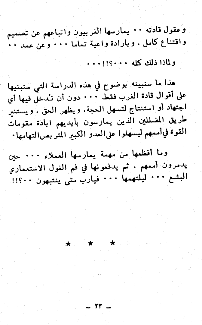 هَذَا مَا سَنُبَيِّنُهُ بوضوح في هذه الدراسة التي سَنُبَيِّنُهَا على أقوال قادة الغرب فقط .. دون أن نُدْخِلَ فيها أي اجتهاد أو استنتاج لتسهل الحجة، ويظهر الحق، ويستنير طريق المضللين الذين يمارسون بأيديهم إبادة مقومات القوة في أممهم ليسهلوا على العدو الكبير المتربص اِلْتِهَامَهَا.