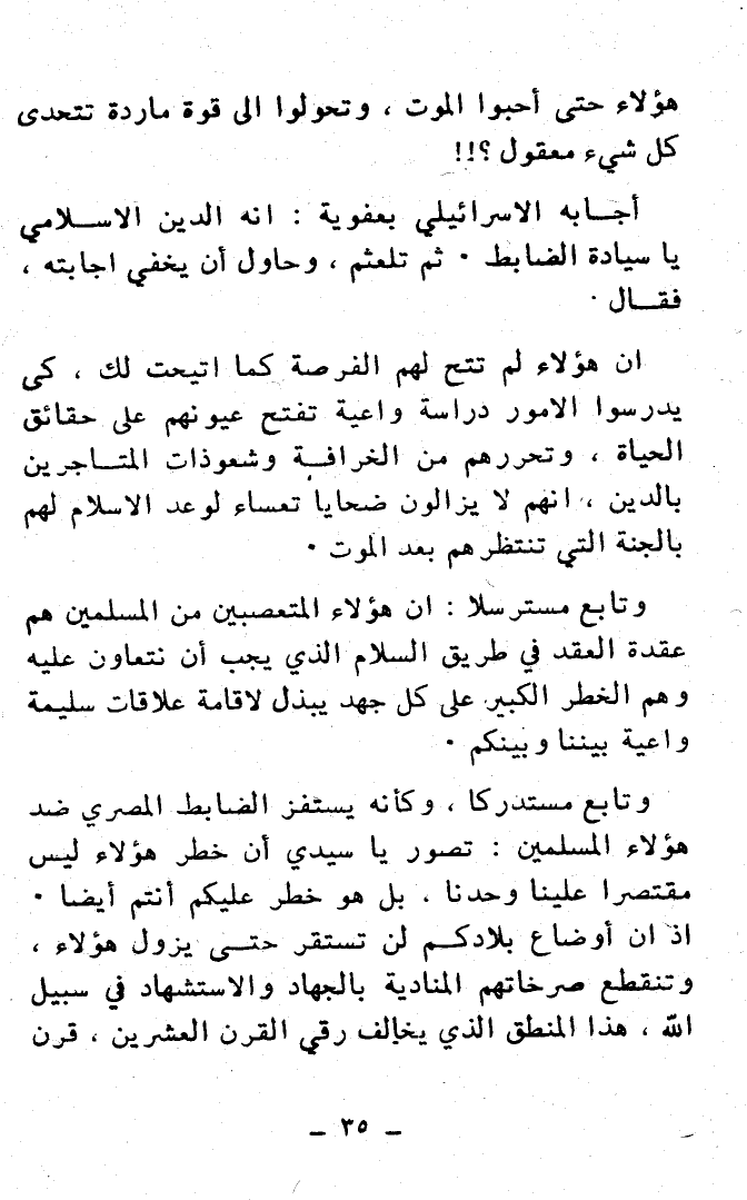 وتابع مستدركًا، وكأنه يستفز الضابط المصرى ضد هؤلاء المسلمين،: «تَصَوَّرْ يَا سَيِّدِي أَنَّ خَطَرَ هَؤُلاَءِ لَيْسَ مُقْتَصِرًا عَلَيْنَا وَحْدَنَا، بَلْ هُوَ خَطَرٌ عَلَيْكُمْ أَنْتُمْ أَيْضًا. إِذْ أَنَّ أَوْضَاعَ بِلاَدَكُمْ لَنْ تَسْتَقِرَّ حَتَّى يَزُولَ هَؤُلاَءِ، وَتَنْقَطِعَ صَرْخَاتُهُمْ المُنَادِيَةِ بِالجِهَادِ وَالاِسْتِشْهَادِ فِي سَبِيلِ اللهِ، هَذَا المَنْطِقُ الذِي يُخَالِفُ رُقِيَّ القَرْنِ العِشْرِينَ، قَرْنَ