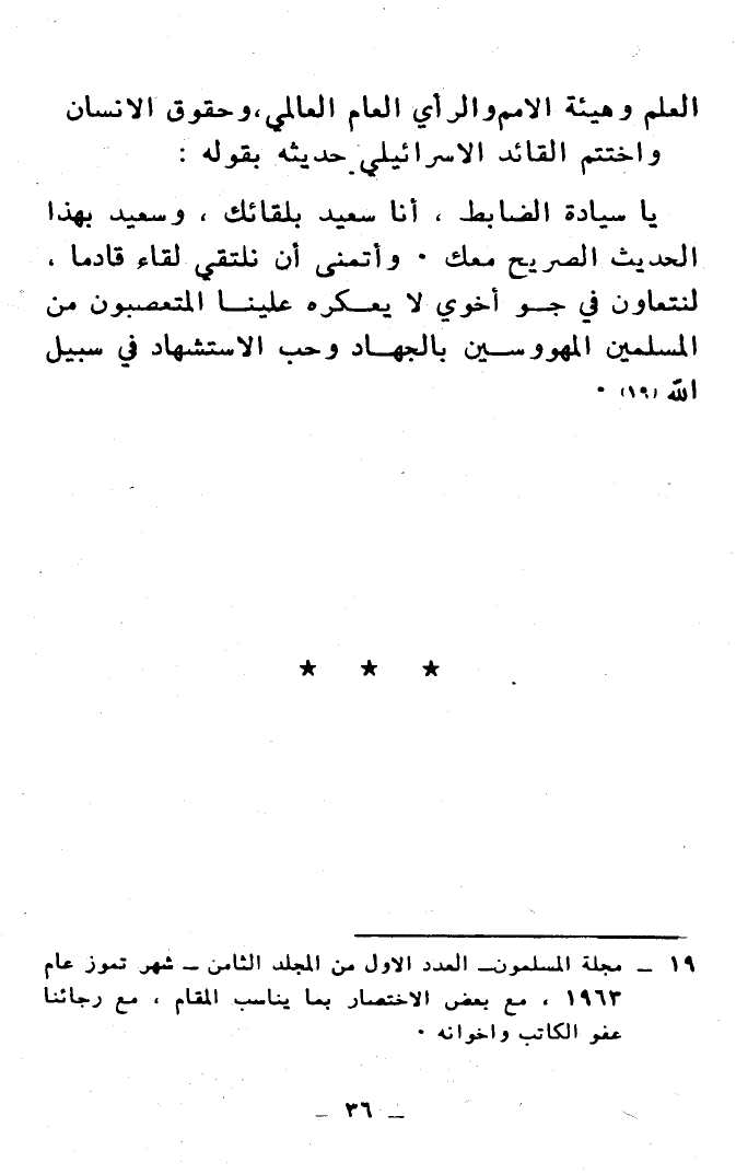 «يَا سِيَادَةَ الضَّابِطِ، أَنَا سَعِيدٌ بِلِقَائِكَ، وَسَعِيدٌ بِهَذَا الحَدِيثِ الصَّرِيحِ مَعَكَ، وَأَتَمَنَّى أَنْ نَلْتَقِي لِقَاءً قَادِمًا، لِنَتَعَاوَنَ فِي جَوٍّ أَخَوِيٍّ لاَ يُعَكِّرُهُ عَلَيْنَا المُتَعَصِّبُونَ مِنَ المُسْلِمِينَ المَهْوُوسِينَ بِالجِهَادِ وَحُبِّ الاِسْتِشْهَادِ فِي سَبِيلِ اللهِ» (¬19).