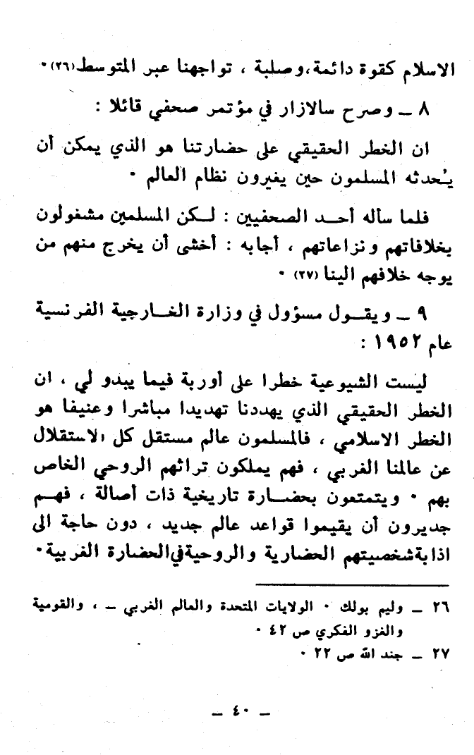 9 - ويقول مسؤول في وزارة الخارجية الفرنسية عام 1952: «لَيْسَتْ الشُيُوعِيَّةُ خَطَرًا عَلَى أُورُوبة فِيمَا يَبْدُو لِي، إِنَّ الخَطَرَ الحَقِيقِيَّ الذِي يُهَدِّدُنَا تَهْدِيدًا مُبَاشِرًا وَعَنِيفًا هَوَ الخَطَرُ الإِسْلاَمِي، فَالمُسْلِمُونَ عَالَمٌ مُسْتَقِلٌّ كُلَّ الاِسْتِقْلاَلِ عَنْ عَالَمِنَا الغَرْبِيِّ، فَهُمْ يَمْلِكُونَ تُرَاثَهُمْ الرُّوحِيَّ الخَاصَّ بِهِمْ. وَيَتَمَتَّعُونَ بِحَضَارَةٍ تَارِيخِيَّةٍ ذَاتَ أَصَالَةٍ، فَهُمْ جَدِيرُونَ أََنْ يُقِيمُوا قَوَاعِدَ عَالَمٍ جَدِيدٍ، دُونَ حَاجَةٍ إِلَى إِذَابَةِ شَخْصِيَّتِهِمْ الحَضَارِيَّةِ وَالرُّوحِيَّةِ فِي الحَضَارَةِ الغَرْبِيَّةِ.