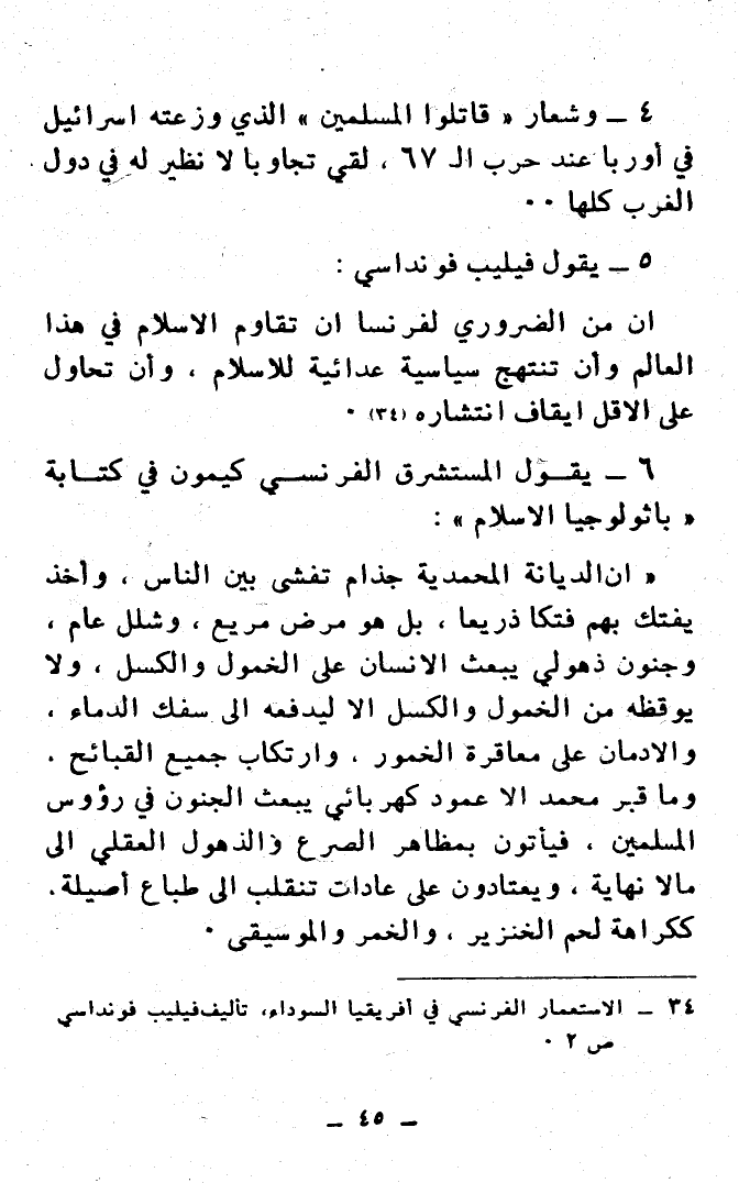 «إِنَّ مِنَ الضَّرُورِيِّ لِفِرَنْسَا أَنْ تُقَاوِمَ الإِسْلاَمَ فِي هَذَا العَالَمِ وَأَنْ تَنْتَهِجَ سِيَاسَةً عِدَائِيَّةً لِلإِسْلاَمِ، وَأَنْ تُحَاوِلَ عَلَى الأَقَلِّ إِيقَافَ اِنْتِشَارِهِ» (¬34).