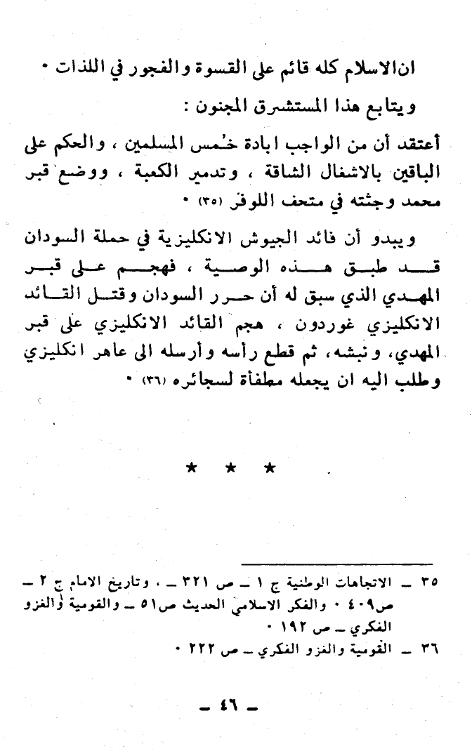 (¬35) " الاتجاهات الوطنية ": ج 1، ص 321. و " تاريخ الإمام ": ج 2 ص 409. و " الفكر الإسلامي الحديث ": ص 51. و " القومية والغزو الفكري ": ص 192.
