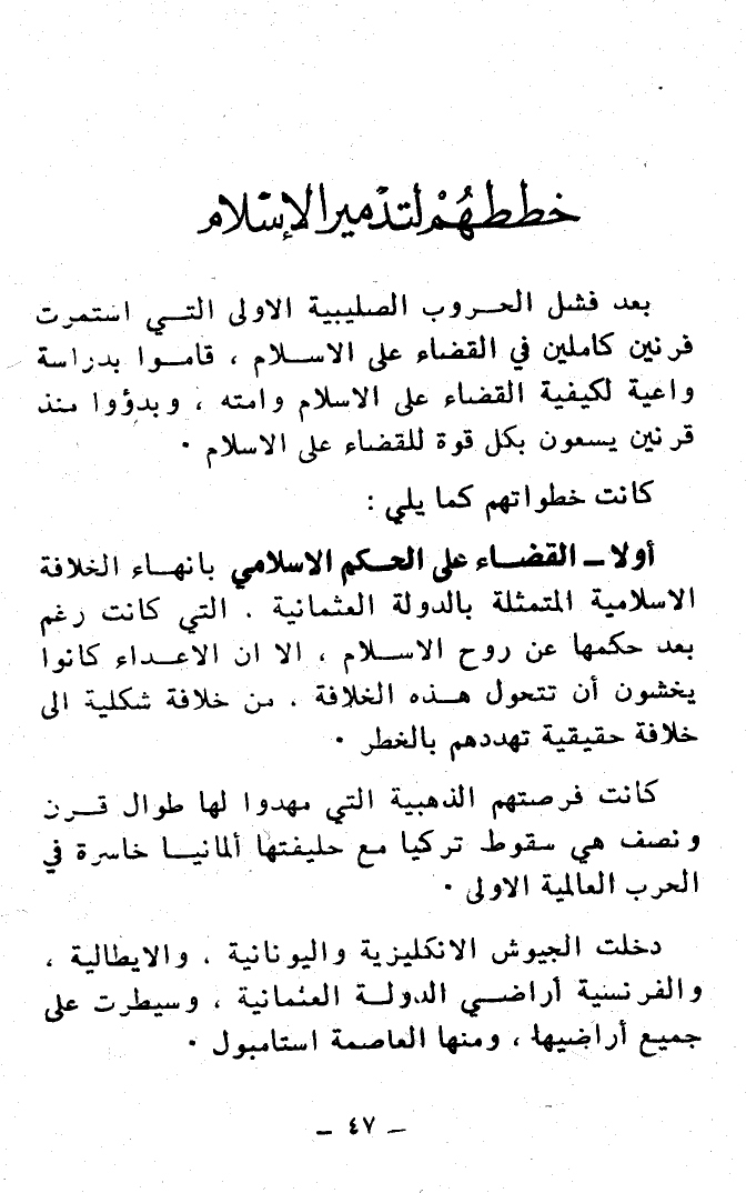 بعد فشل الحروب الصليبية الأولى التي استمرت قرنين كاملين في القضاء على الإسلام، قاموا بدراسة واعية لكيفية القضاء على الإسلام وأمته، وبدأوا منذ قرنين يسعون بكل قوة للقضاء على الإسلام.