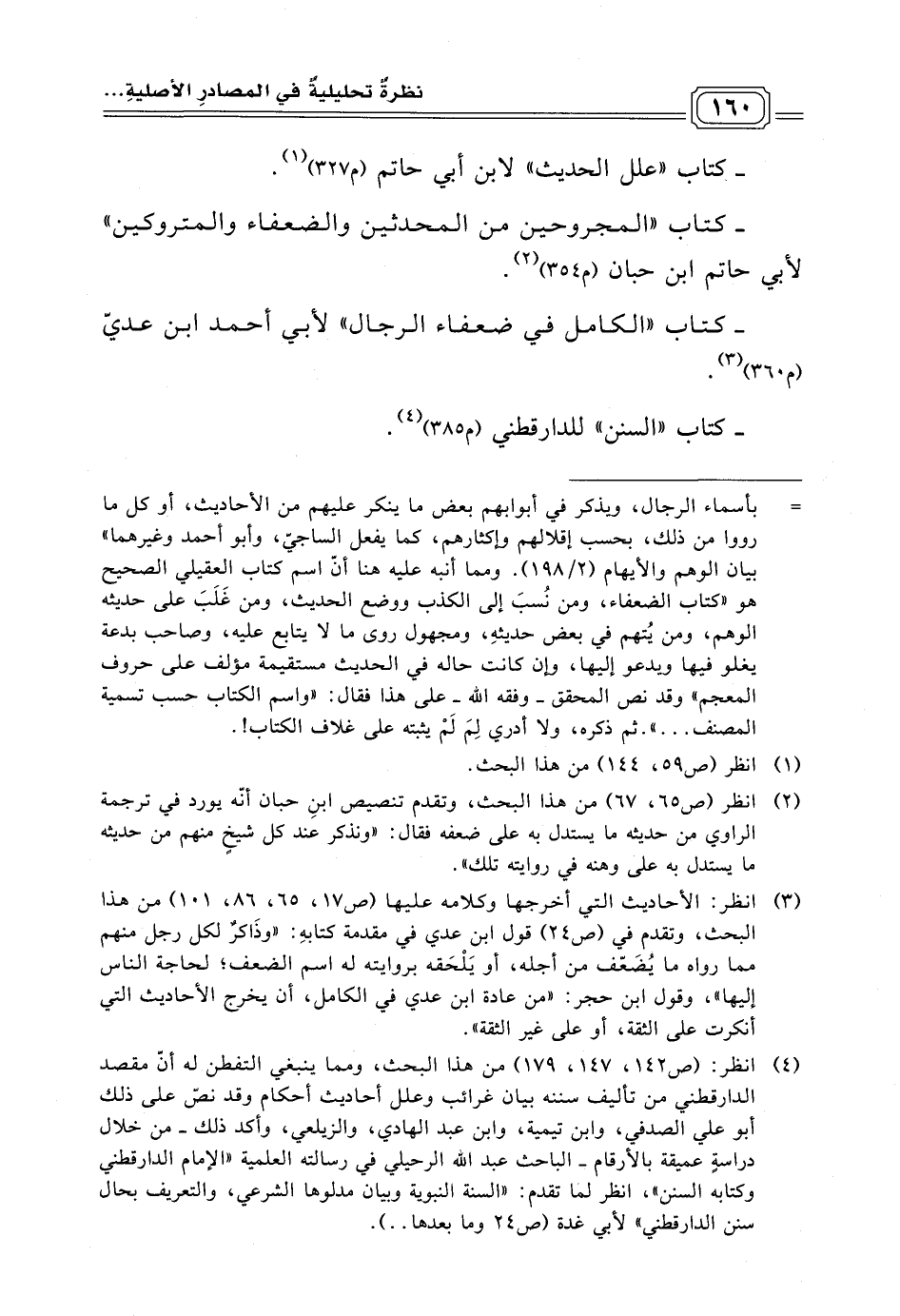 (¬4) انظر: ص 124، 129، 148 من هذا البحث، ومما ينبغي التفطن له أنّ مقصد الدارقطني من تأليف سننه بيان غرائب وعلل أحاديث أحكام وقد نصّ على ذلك أبو علي الصدفي، وابن تيمية، وابن عبد الهادي، والزيلعي، وأكد ذلك - من خلال دراسةٍ عميقة بالأرقام - الباحث عبد الله الرحيلي في رسالته العلمية "الإمام الدارقطني وكتابه السنن"، انظر لما تقدم: "السنة النبوية وبيان مدلوها الشرعي، والتعريف بحال سنن الدارقطني" لأبي غدة (ص: 24 وما بعدها ..).