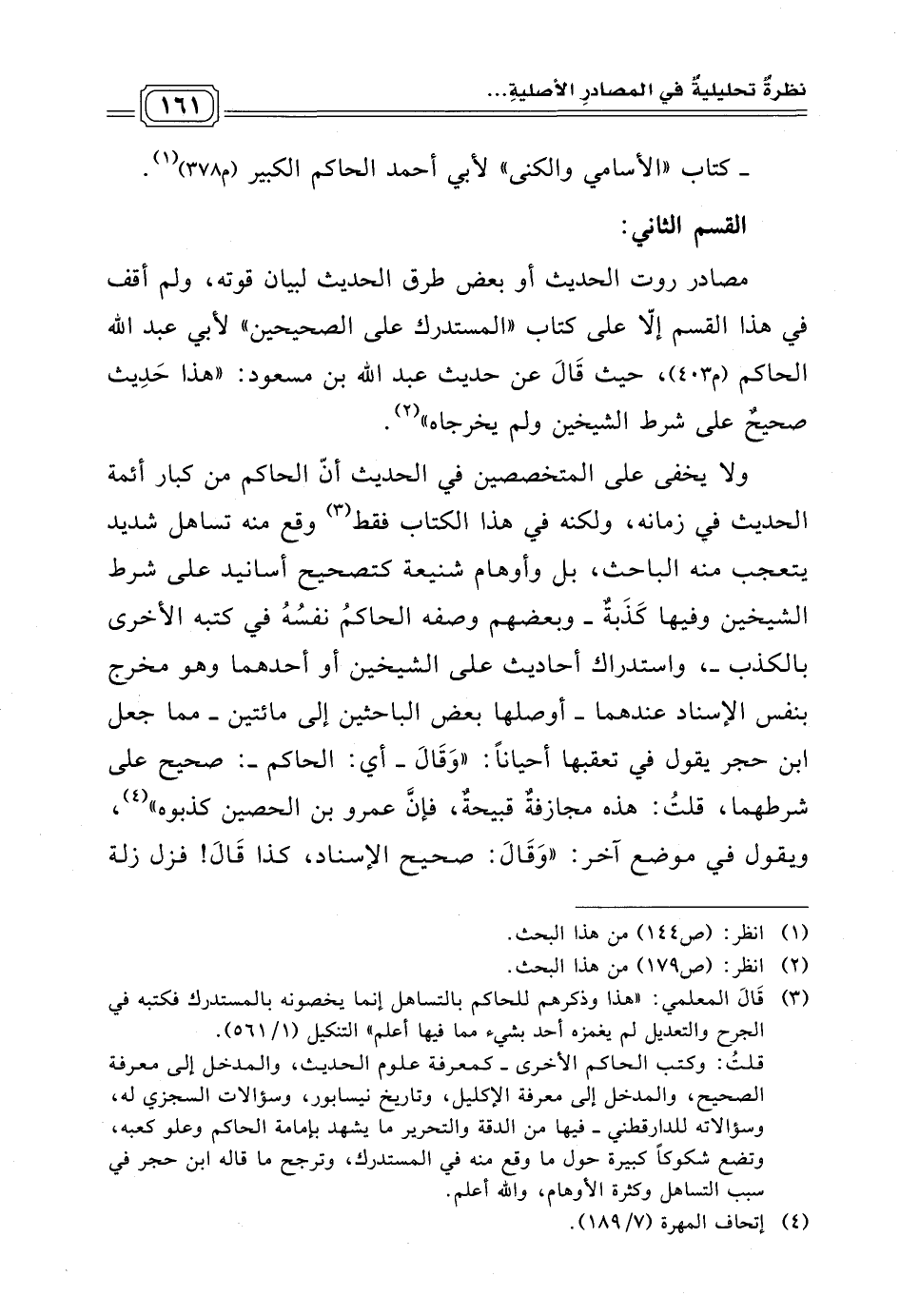 ولا يخفى على المتخصصين في الحديث أنّ الحاكم من كبار أئمة الحديث في زمانه، ولكنه في هذا الكتاب فقط (¬3)