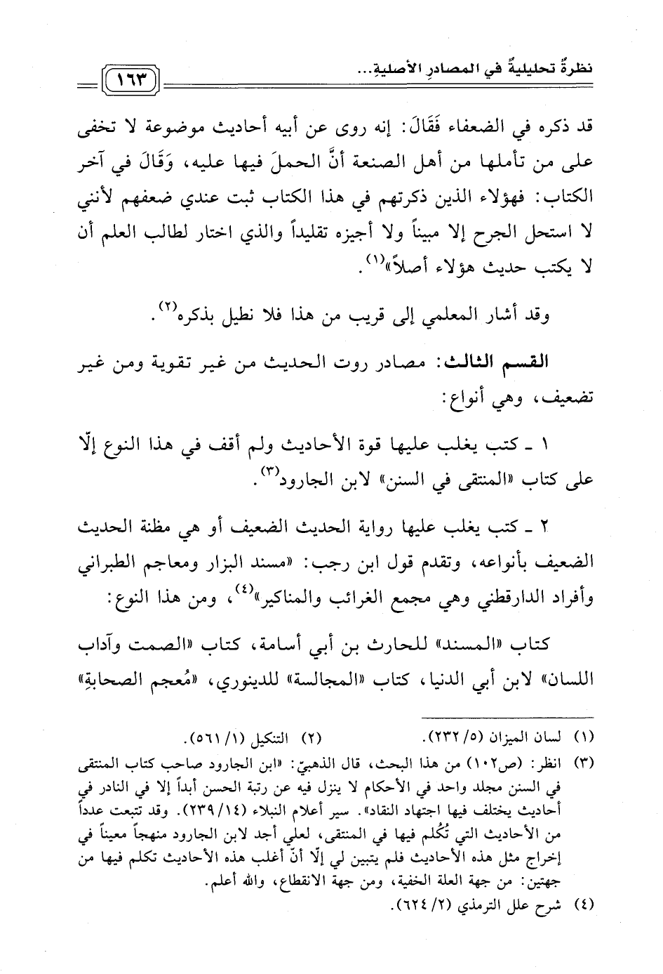 (¬3) انظر: ص 87 من هذا البحث، قال الذهبيّ: ((ابن الجارود صاحب كتاب المنتقى في السنن مجلد واحد في الأحكام لا ينزل فيه عن رتبة الحسن أبدا إلا في النادر في أحاديث يختلف فيها اجتهاد النقاد)). سير أعلام النبلاء (14/ 239).وقد تتبعت عدداً من الأحاديث التي تُكُلم فيها في المنتقى لعلي أجد لابن الجارود منهجاً معيناً في إخراج مثل هذه الأحاديث فلم يتبين لي إلاّ أنّ أغلب هذه الأحاديث تكلم فيها من جهتين: من جهة العلة الخفية، ومن جهة الانقطاع، والله أعلم.