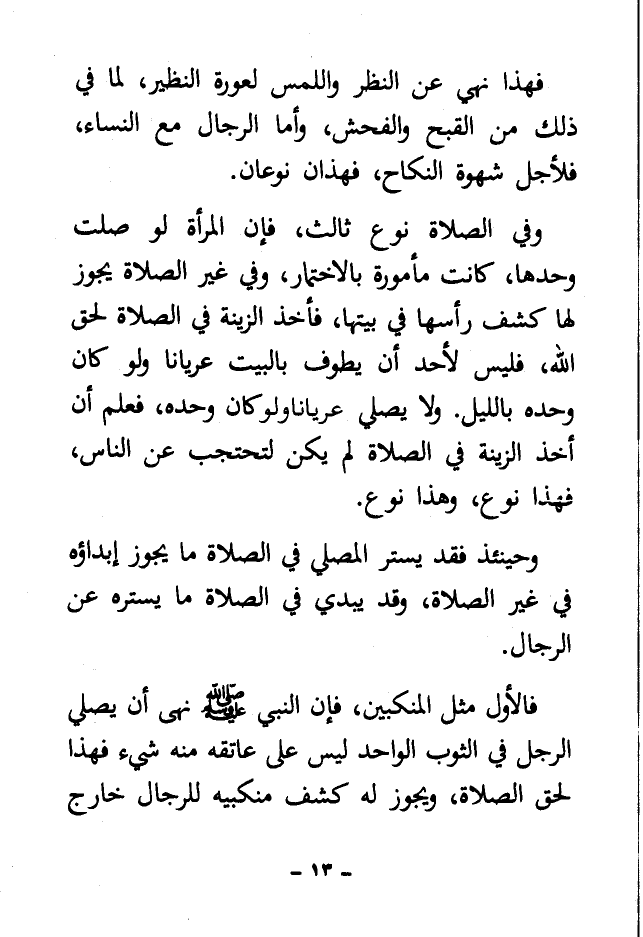 وفي الصلاة نوع ثالث، فإن المرأة لو صلت وحدها، كانت مأمورة بالاختمار، وفي غير الصلاة يجوز لها كشف رأسها في بيتها، فأخذ الزينة في الصلاة لحق الله، فليس لأحد أن يطوف بالبيت عريانا ولو كان وحده بالليل. ولا يصلي عريانا ولو كان وحده، فعلم أن أخذ الزينة في الصلاة لم يكن لتحتجب عن الناس، فهذا نوع، وهذا نوع.