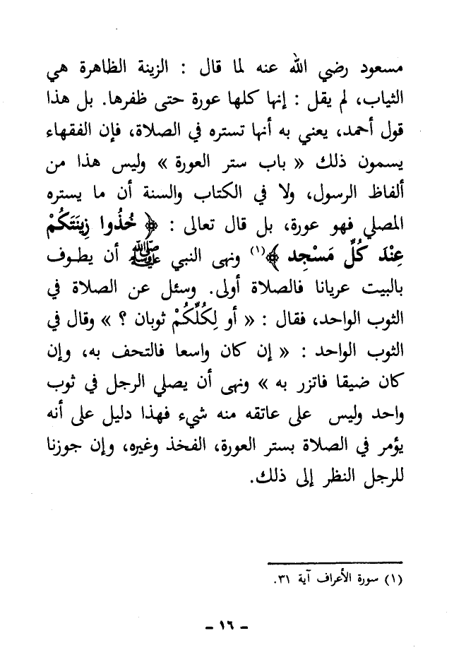 وابن مسعود - رضي الله عنه - لما قال: الزينة الظاهرة هي الثياب، لم يقل: إنها كلها عورة حتى ظفرها. بل هذا قول أحمد، يعني به أنها تستره في الصلاة، فإن الفقهاء يسمون ذلك " باب ستر العورة " وليس هذا من ألفاظ الرسول، ولا في الكتاب والسنة أن ما يستره المصلى فهو عورة، بل قال تعالى: {خُذُوا زِينَتَكُمْ عِنْدَ كُلِّ مَسْجِدٍ} [الأعراف: 31] (¬1) .