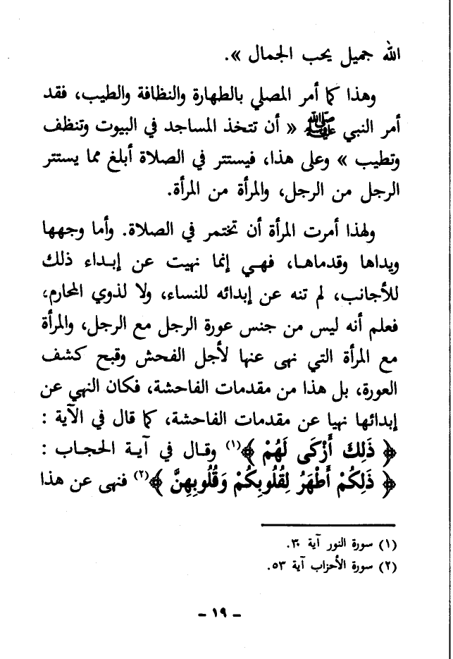 وهذا كما أمر المصلي بالطهارة والنظافة والطيب، فقد أمر النبي - صلى الله عليه وسلم - «أن تتخذ المساجد في البيوت وتنظف وتطيب» وعلى هذا، فيستتر في الصلاة أبلغ مما يستتر الرجل من الرجل، والمرأة من المرأة.