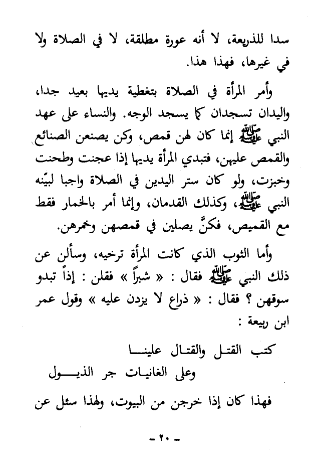 وأمر المرأة في الصلاة بتغطية يديها بعيد جدا، واليدان تسجدان كما يسجد الوجه. والنساء على عهد النبي - صلى الله عليه وسلم - إنما كان لهن قمص، وكن يصنعن الصنائع والقمص عليهن، فتبدي المرأة يديها إذا عجنت وطحنت وخبزت، ولو كان ستر اليدين في الصلاة واجبا لبينه النبي - صلى الله عليه وسلم -، وكذلك القدمان، وإنما أمر بالخمار فقط مع القميص، فكنَّ يصلين في قمصهن وخمرهن.
