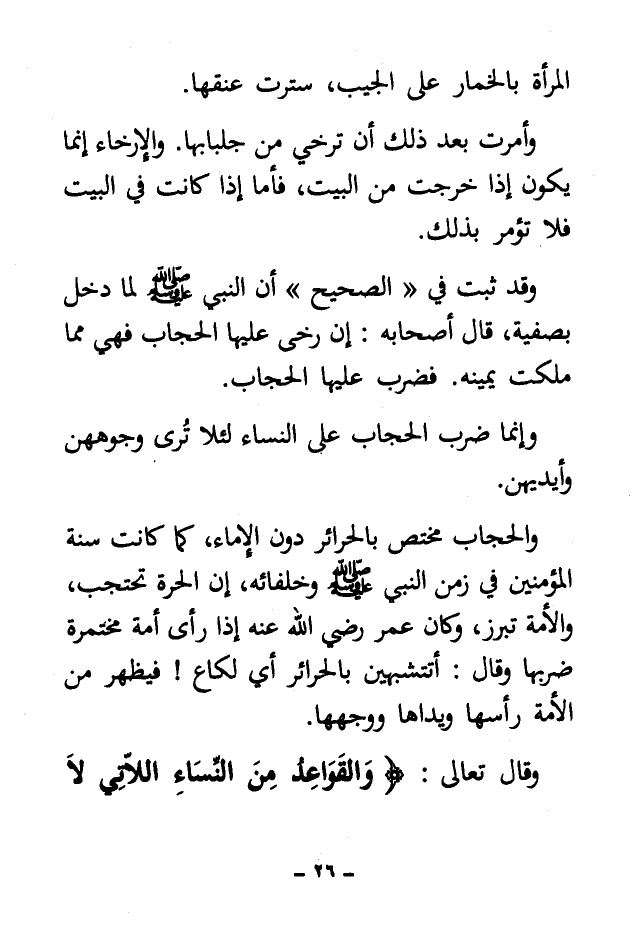 والحجاب مختص بالحرائر دون الإماء، كما كانت سنة المؤمنين في زمن النبي - صلى الله عليه وسلم - وخلفائه، إن الحرة تحتجب، والأمة تبرز، وكان عمر - رضي الله عنه - إذا رأى أمة مختمرة ضربها وقال: أتتشبهين بالحرائر أي لكاع! فيظهر من الأمة رأسها ويداها ووجهها.