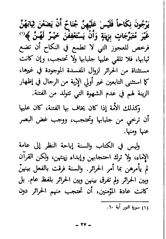 {وَالْقَوَاعِدُ مِنَ النِّسَاءِ اللَّاتِي لَا يَرْجُونَ نِكَاحًا فَلَيْسَ عَلَيْهِنَّ جُنَاحٌ أَنْ يَضَعْنَ ثِيَابَهُنَّ غَيْرَ مُتَبَرِّجَاتٍ بِزِينَةٍ وَأَنْ يَسْتَعْفِفْنَ خَيْرٌ لَهُنَّ} [النور: 60] (¬1) فرخص للعجوز التي لا تطمع في النكاح أن تضع ثيابها، فلا تلقي عليها جلبابها ولا تحتجب، وإن كانت مستثناة من الحرائر لزوال المفسدة الموجودة في غيرها، كما استثنى التابعين غير أولي الإربة من الرجال في إظهار الزينة لهم في عدم الشهوة التي تتولد من الفتنة.