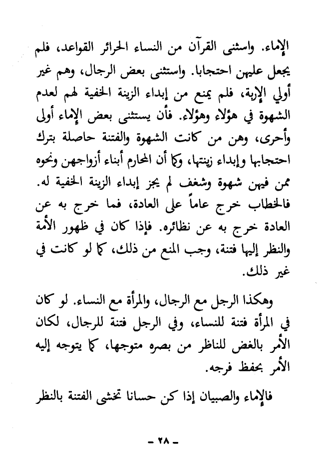 وهكذا الرجل مع الرجال، والمرأة مع النساء. لو كان في المرأة فتنة للنساء، وفي الرجل فتنة للرجال، لكان الأمر بالغض للناظر من بصره متوجها، كما يتوجه إليه الأمر بحفظ فرجه.