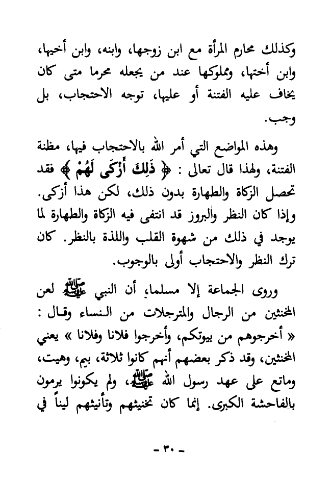 وهذه المواضع التي أمر الله بالاحتجاب فيها، مظنة الفتنة، ولهذا قال تعالى: {ذَلِكَ أَزْكَى لَهُمْ} [النور: 30] فقد تحصل الزكاة والطهارة بدون ذلك، لكن هذا أزكى. وإذا كان النظر والبروز قد انتفى فيه الزكاة والطهارة لما يوجد في ذلك من شهوة القلب واللذة بالنظر. كان ترك النظر والاحتجاب أولى بالوجوب.
