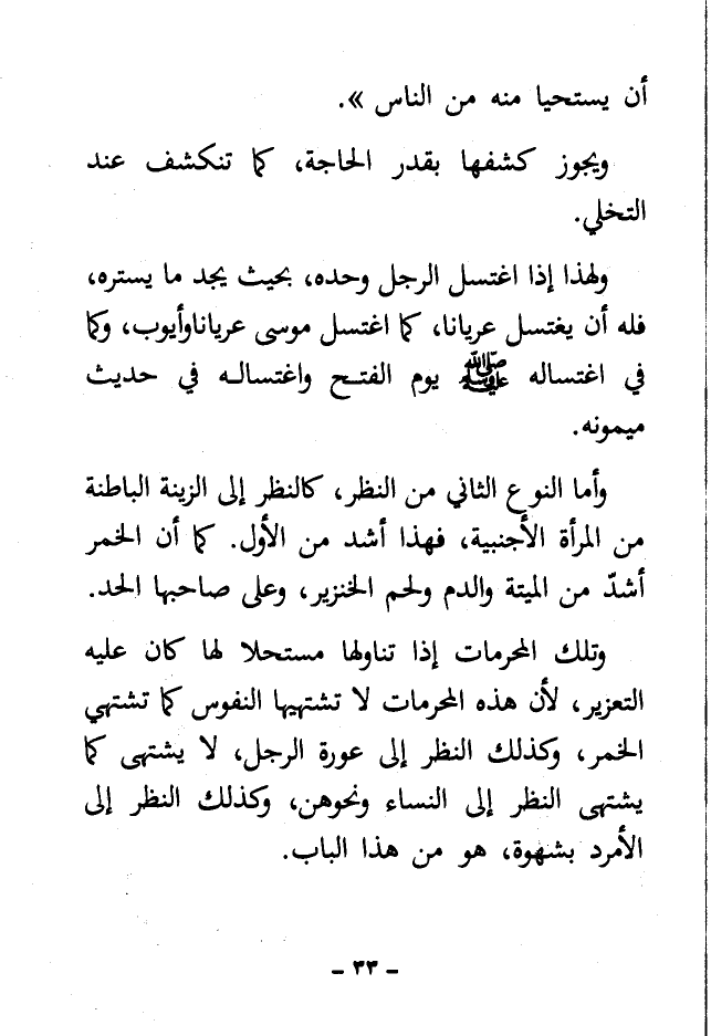 وأما النوع الثاني من النظر، كالنظر إلى الزينة الباطنة من المرأة الأجنبية، فهذا أشد من الأول. كما أن الخمر أشدّ من الميتة والدم ولحم الخنزير، وعلى صاحبها الحد. وتلك المحرمات إذا تناولها مستحلا لها كان عليه التعزير، لأن هذه المحرمات لا تشتهيها النفوس كما تشتهي الخمر، وكذلك النظر إلى عورة الرجل، لا يشتهى كما يشتهى النظر إلى النساء ونحوهن، وكذلك النظر إلى الأمرد بشهوة، هو من هذا الباب.
