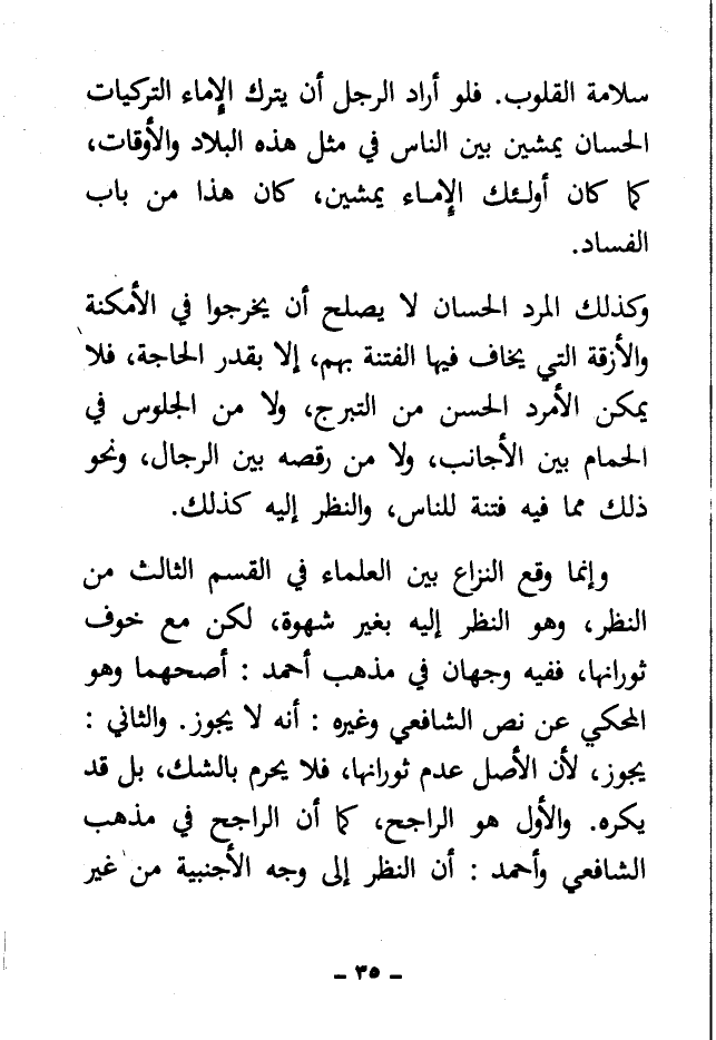 سلامة القلوب. فلو أراد الرجل أن يترك الإماء التركيات الحسان يمشين بين الناس في مثل هذه البلاد والأوقات، كما كان أولئك الإماء يمشين، كان هذا من باب الفساد.