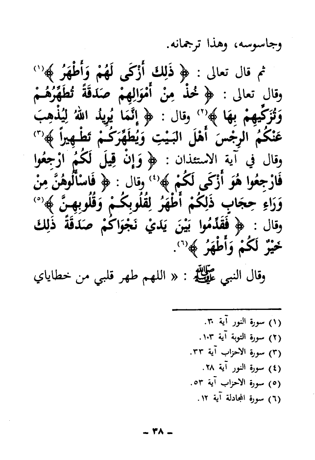 ثم قال تعالى: {ذَلِكَ أَزْكَى لَهُمْ} [النور: 30] (¬1) وقال تعالى: {خُذْ مِنْ أَمْوَالِهِمْ صَدَقَةً تُطَهِّرُهُمْ وَتُزَكِّيهِمْ بِهَا} [التوبة: 103] (¬2) وقال: {إِنَّمَا يُرِيدُ اللَّهُ لِيُذْهِبَ عَنْكُمُ الرِّجْسَ أَهْلَ الْبَيْتِ وَيُطَهِّرَكُمْ تَطْهِيرًا} [الأحزاب: 33] (¬3) وقال في آية الاستئذان: {وَإِنْ قِيلَ لَكُمُ ارْجِعُوا فَارْجِعُوا هُوَ أَزْكَى لَكُمْ} [النور: 28] (¬4) وقال: {فَاسْأَلُوهُنَّ مِنْ وَرَاءِ حِجَابٍ ذَلِكُمْ أَطْهَرُ لِقُلُوبِكُمْ وَقُلُوبِهِنَّ} [الأحزاب: 53] (¬5) وقال: {فَقَدِّمُوا بَيْنَ يَدَيْ نَجْوَاكُمْ صَدَقَةً ذَلِكَ خَيْرٌ لَكُمْ وَأَطْهَرُ} [المجادلة: 12] (¬6) وقال النبي - صلى الله عليه وسلم -: «اللهم طهر قلبي من خطاياي