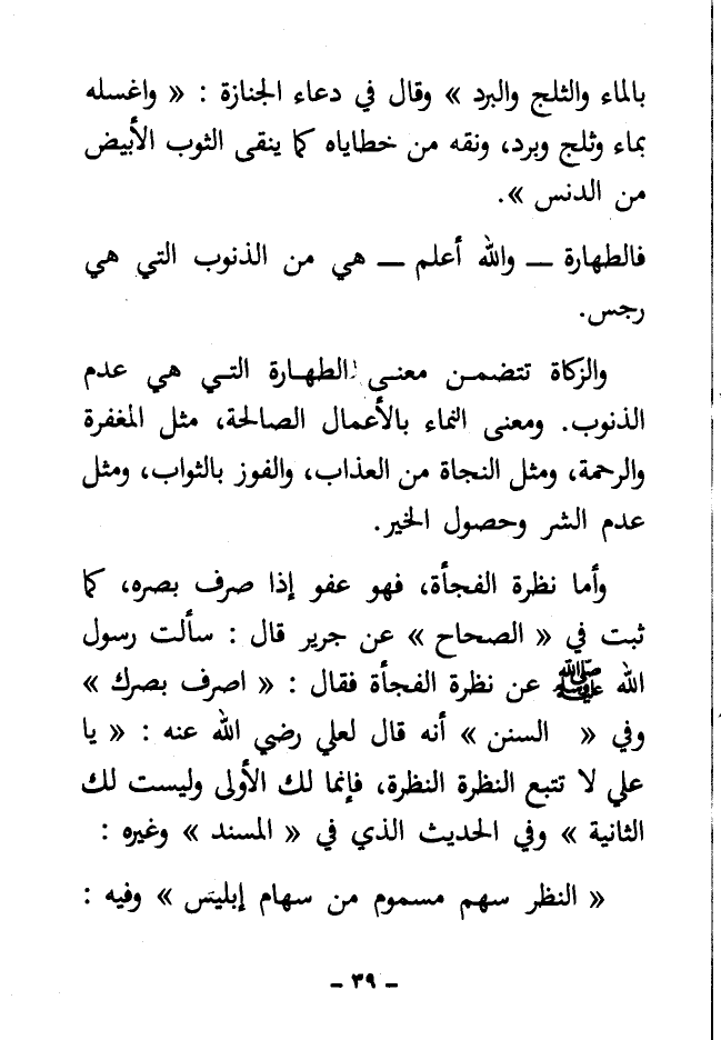 وأما نظرة الفجأة، فهو عفو إذا صرف بصره، كما ثبت في " الصحاح " عن جرير قال: «سألت رسول الله - صلى الله عليه وسلم - عن نظرة الفجأة فقال: اصرف بصرك» وفي " السنن " أنه قال لعلي رضي الله عنه: «يا علي لا تتبع النظرة النظرة، فإنما لك الأولى وليست لك الثانية» وفي الحديث الذي في " المسند " وغيره: «النظر سهم مسموم من سهام إبليس» وفيه: