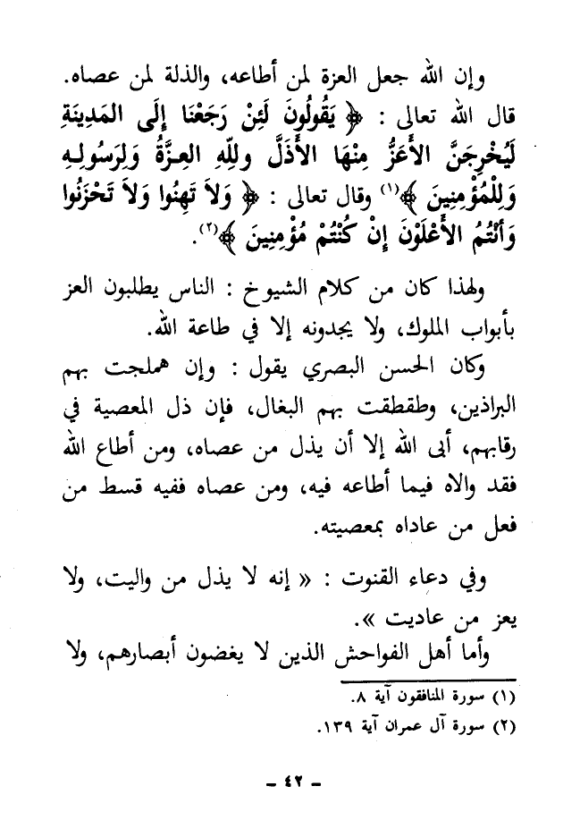 قال الله تعالى: {يَقُولُونَ لَئِنْ رَجَعْنَا إِلَى الْمَدِينَةِ لَيُخْرِجَنَّ الْأَعَزُّ مِنْهَا الْأَذَلَّ وَلِلَّهِ الْعِزَّةُ وَلِرَسُولِهِ وَلِلْمُؤْمِنِينَ} [المنافقون: 8] (¬1) وقال تعالى: {وَلَا تَهِنُوا وَلَا تَحْزَنُوا وَأَنْتُمُ الْأَعْلَوْنَ إِنْ كُنْتُمْ مُؤْمِنِينَ} [آل عمران: 139] (¬2) .