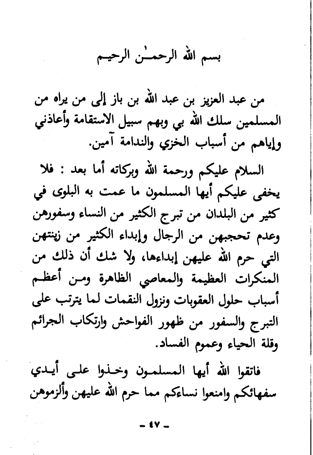 من عبد العزيز بن عبد الله بن باز إلى من يراه من المسلمين سلك الله بي وبهم سبيل الاستقامة وأعاذني وإياهم من أسباب الخزي والندامة آمين.