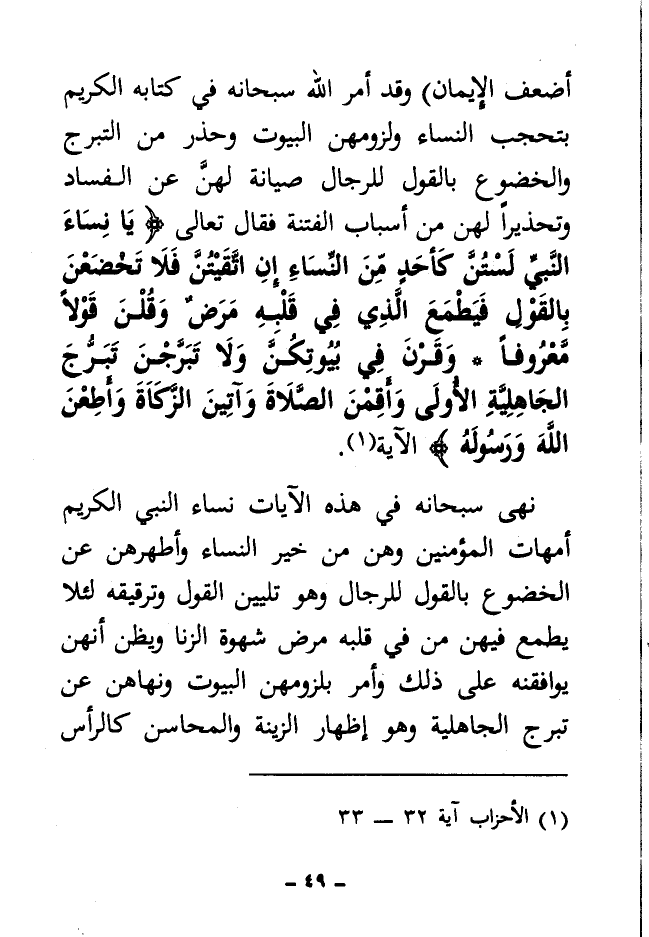 أضعف الإيمان» وقد أمر الله سبحانه في كتابه الكريم بتحجب النساء ولزومهن البيوت وحذر من التبرج والخضوع بالقول للرجال صيانة لهنً عن الفساد وتحذيرا لهن من أسباب الفتنة فقال تعالى {يَا نِسَاءَ النَّبِيِّ لَسْتُنَّ كَأَحَدٍ مِنَ النِّسَاءِ إِنِ اتَّقَيْتُنَّ فَلا تَخْضَعْنَ بِالْقَوْلِ فَيَطْمَعَ الَّذِي فِي قَلْبِهِ مَرَضٌ وَقُلْنَ قَوْلا مَعْرُوفًا - وَقَرْنَ فِي بُيُوتِكُنَّ وَلَا تَبَرَّجْنَ تَبَرُّجَ الْجَاهِلِيَّةِ الْأُولَى وَأَقِمْنَ الصَّلَاةَ وآتِينَ الزَّكَاةَ وَأَطِعْنَ اللَّهَ وَرَسُولَهُ} [الأحزاب: 32 - 33] (¬1) .