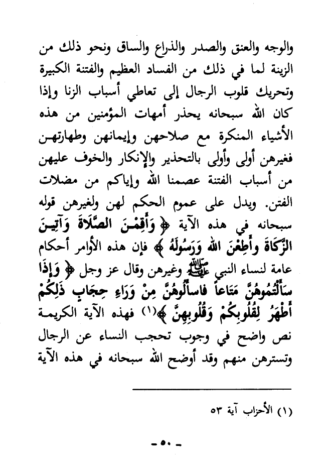 والوجه والعنق والصدر والذراع والساق ونحو ذلك من الزينة لما في ذلك من الفساد العظيم والفتنة الكبيرة وتحريك قلوب الرجال إلى تعاطي أسباب الزنا، وإذا كان الله سبحانه يحذر أمهات المؤمنين من هذه الأشياء المنكرة مع صلاحهن وإيمانهن وطهارتهن فغيرهن أولى وأولى بالتحذير والإنكار والخوف عليهن من أسباب الفتنة عصمنا الله وإياكم من مضلات الفتن. ويدل على عموم الحكم لهن ولغيرهن قوله سبحانه في هذه الآية {وَأَقِمْنَ الصَّلَاةَ وآتِينَ الزَّكَاةَ وَأَطِعْنَ اللَّهَ وَرَسُولَهُ} [الأحزاب: 33] فإن هذه الأوامر أحكام عامة لنساء النبي - صلى الله عليه وسلم - وغيرهن وقال عز وجل {وَإِذَا سَأَلْتُمُوهُنَّ مَتَاعًا فَاسْأَلُوهُنَّ مِنْ وَرَاءِ حِجَابٍ ذَلِكُمْ أَطْهَرُ لِقُلُوبِكُمْ وَقُلُوبِهِنَّ} [الأحزاب: 53] (¬1) فهذه الآية الكريمة نص واضح في وجوب تحجب النساء عن الرجال وتسترهن منهم وقد أوضح الله سبحانه في هذه الآية