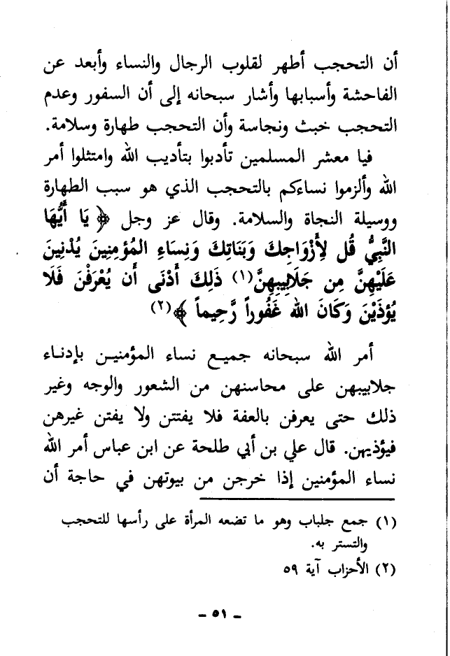 فيا معشر المسلمين تأدبوا بتأديب الله وامتثلوا أمر الله وألزموا نساءكم بالتحجب الذي هو سبب الطهارة ووسيلة النجاة والسلامة. وقال عز وجل {يَا أَيُّهَا النَّبِيُّ قُلْ لِأَزْوَاجِكَ وَبَنَاتِكَ وَنِسَاءِ الْمُؤْمِنِينَ يُدْنِينَ عَلَيْهِنَّ مِنْ جَلَابِيبِهِنَّ (¬1) ذَلِكَ أَدْنَى أَنْ يُعْرَفْنَ فَلَا يُؤْذَيْنَ وَكَانَ اللَّهُ غَفُورًا رَحِيمًا} [الأحزاب: 59] (¬2) .