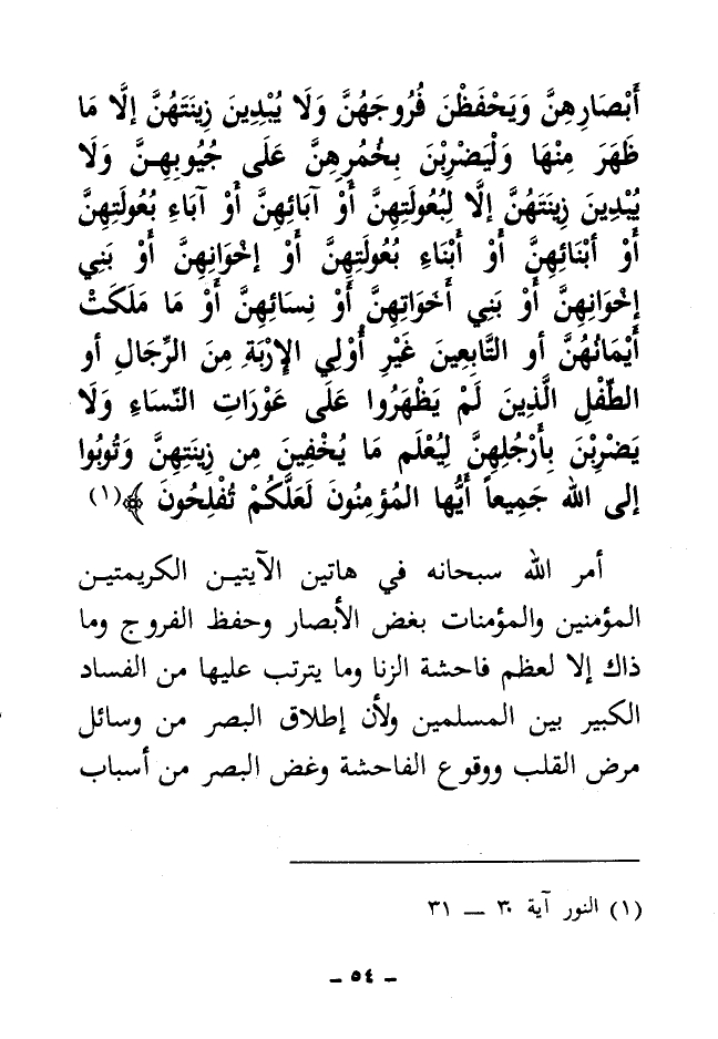 {قُلْ لِلْمُؤْمِنِينَ يَغُضُّوا مِنْ أَبْصَارِهِمْ وَيَحْفَظُوا فُرُوجَهُمْ ذَلِكَ أَزْكَى لَهُمْ إِنَّ اللَّهَ خَبِيرٌ بِمَا يَصْنَعُونَ - وَقُلْ لِلْمُؤْمِنَاتِ يَغْضُضْنَ مِنْ أَبْصَارِهِنَّ وَيَحْفَظْنَ فُرُوجَهُنَّ وَلَا يُبْدِينَ زِينَتَهُنَّ إِلَّا مَا ظَهَرَ مِنْهَا وَلْيَضْرِبْنَ بِخُمُرِهِنَّ عَلَى جُيُوبِهِنَّ وَلَا يُبْدِينَ زِينَتَهُنَّ إِلَّا لِبُعُولَتِهِنَّ أَوْ آبَائِهِنَّ أَوْ آبَاءِ بُعُولَتِهِنَّ أَوْ أَبْنَائِهِنَّ أَوْ أَبْنَاءِ بُعُولَتِهِنَّ أَوْ إِخْوَانِهِنَّ أَوْ بَنِي إِخْوَانِهِنَّ أَوْ بَنِي أَخَوَاتِهِنَّ أَوْ نِسَائِهِنَّ أَوْ مَا مَلَكَتْ أَيْمَانُهُنَّ أَوِ التَّابِعِينَ غَيْرِ أُولِي الْإِرْبَةِ مِنَ الرِّجَالِ أَوِ الطِّفْلِ الَّذِينَ لَمْ يَظْهَرُوا عَلَى عَوْرَاتِ النِّسَاءِ وَلَا يَضْرِبْنَ بِأَرْجُلِهِنَّ لِيُعْلَمَ مَا يُخْفِينَ مِنْ زِينَتِهِنَّ وَتُوبُوا إِلَى اللَّهِ جَمِيعًا أَيُّهَ الْمُؤْمِنُونَ لَعَلَّكُمْ تُفْلِحُونَ} [النور: 30 - 31] (¬1) أمر الله سبحانه في هاتين الآيتين الكريمتين المؤمنين والمؤمنات بغض الأبصار وحفظ الفروج وما ذاك إلا لعظم فاحشة الزنا وما يترتب عليها من الفساد الكبير بين المسلمين ولأن إطلاق البصر من وسائل مرض القلب ووقوع الفاحشة وغض البصر من أسباب