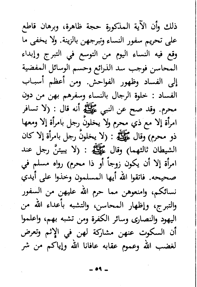 ذلك وأن الآية المذكورة حجة ظاهرة، وبرهان قاطع على تحريم سفور النساء وتبرجهن بالزينة. ولا يخفى ما وقع فيه النساء اليوم من التوسع في التبرج وإبداء المحاسن فوجب سد الذرائع وحسم الوسائل المفضية إلى الفساد وظهور الفواحش. ومن أعظم أسباب الفساد: خلوة الرجال بالنساء وسفرهم بهن من دون محرم. وقد صح عن النبي - صلى الله عليه وسلم - أنه قال: «لا تسافر امرأة إلا مع ذي محرم ولا يخلون رجل بامرأة إلا ومعها ذو محرم» وقال - صلى الله عليه وسلم -: «لا يخلون رجل بامرأة إلا كان الشيطان ثالثهما» وقال - صلى الله عليه وسلم -: «لا يبيتَنّ رجل عند امرأة إلا أن يكون زوجاً أو ذا محرم» رواه مسلم في صحيحه. فاتقوا الله أيها المسلمون وخذوا على أيدي نسائكم، وامنعوهن مما حرم الله عليهن من السفور والتبرج، وإظهار المحاسن، والتشبه بأعداء الله من اليهود والنصارى وسائر الكفرة ومن تشبه بهم، واعلموا أن السكوت عنهن مشاركة لهن في الإثم وتعرض لغضب الله وعموم عقابه عافانا الله وإياكم من شر