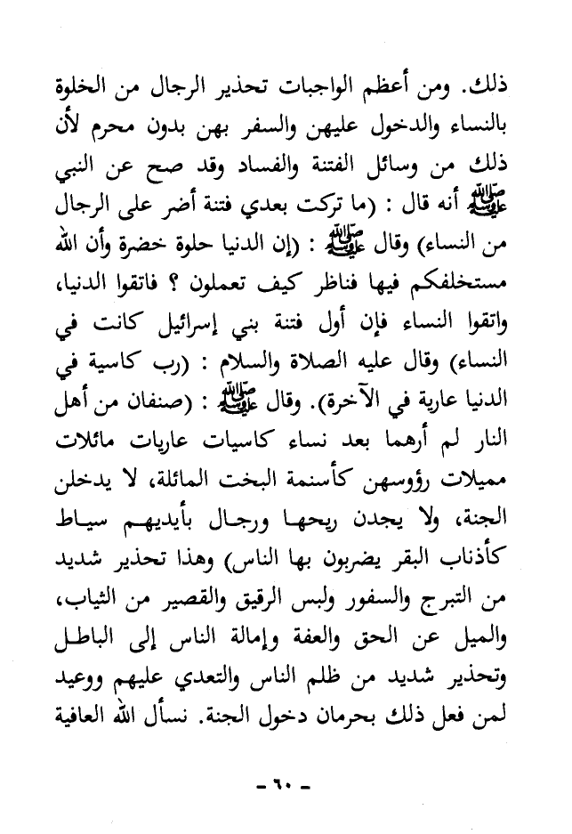 ذلك. ومن أعظم الواجبات تحذير الرجال من الخلوة بالنساء والدخول عليهن والسفر بهن بدون محرم لأن ذلك من وسائل الفتنة والفساد وقد صح عن النبي - صلى الله عليه وسلم - أنه قال: «ما تركت بعدى فتنة أضر على الرجال من النساء» وقال - صلى الله عليه وسلم -: «إن الدنيا حلوة خضرة وأن الله مستخلفكم فيها فناظر كيف تعملون؟ فاتقوا الدنيا، واتقوا النساء فإن أول فتنة بني إسرائيل كانت في النساء» وقال عليه الصلاة والسلام: «رب كاسية في الدنيا عارية في الآخرة» وقال - صلى الله عليه وسلم -: «صنفان من أهل النار لم أرهما بعد نساء كاسيات عاريات مائلات مميلات رؤوسهن كأسنمة البخت المائلة، لا يدخلن الجنة، ولا يجدن ريحها ورجال بأيديهم سياط كأذناب البقر يضربون بها الناس» وهذا تحذير شديد من التبرج والسفور ولبس الرقيق والقصير من الثياب، والميل عن الحق والعفة وإمالة الناس إلى الباطل وتحذير شديد من ظلم الناس والتعدي عليهم ووعيد لمن فعل ذلك بحرمان دخول الجنة. نسأل الله العافية