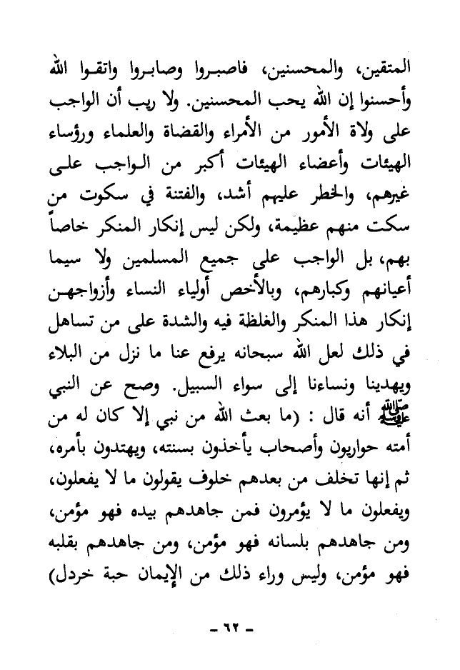 المتقين، والمحسنين، فاصبروا وصابروا واتقوا الله وأحسنوا إن الله يحب المحسنين. ولا ريب أن الواجب على ولاة الأمور من الأمراء والقضاة والعلماء ورؤساء الهيئات وأعضاء الهيئات أكبر من الواجب على غيرهم، والخطر عليهم أشد، والفتنة في سكوت من سكت منهم عظيمة، ولكن ليس إنكار المنكر خاصا بهم، بل الواجب على جميع المسلمين ولا سيما أعيانهم وكبارهم، وبالأخص أولياء النساء وأزواجهن إنكار هذا المنكر والغلظة فيه والشدة على من تساهل في ذلك لعل الله سبحانه يرفع عنا ما نزل من البلاء ويهدينا ونساءنا إلى سواء السبيل. وصح عن النبي - صلى الله عليه وسلم - أنه قال: «ما بعث الله من نبي إلا كان له من أمته حواريون وأصحاب يأخذون بسنته، ويهتدون بأمره، ثم إنها تخلف من بعدهم خلوف يقولون ما لا يفعلون، ويفعلون ما لا يؤمرون فمن جاهدهم بيده فهو مؤمن، ومن جاهدهم بلسانه فهو مؤمن، ومن جاهدهم بقلبه فهو مؤمن، وليس وراء ذلك من الإيمان حبة خردل» .