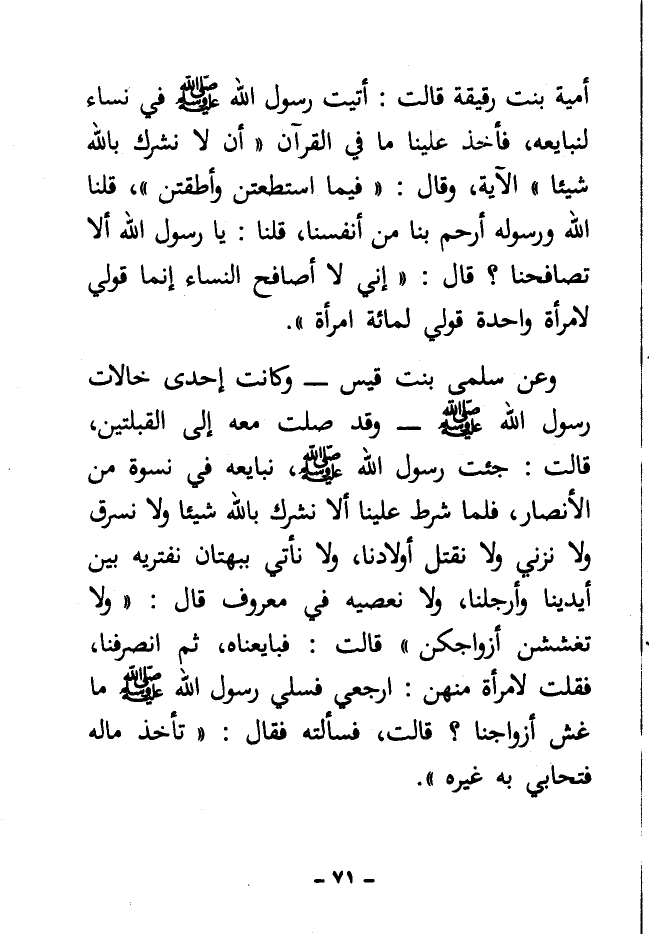 أمية بنت رقيقة قالت: «أتيت رسول الله - صلى الله عليه وسلم - في نساء لنبايعه، فأخذ علينا ما في القرآن {أَنْ نُشْرِكَ بِاللَّهِ مِنْ شَيْءٍ} [يوسف: 38] الآية، وقال: فيما استطعتن وأطقتن قلنا الله ورسوله أرحم بنا من أنفسنا، قلنا: يا رسول الله ألا تصافحنا؟ قال: إني لا أصافح النساء إنما قولي لامرأة واحدة قولي لمائة امرأة.»