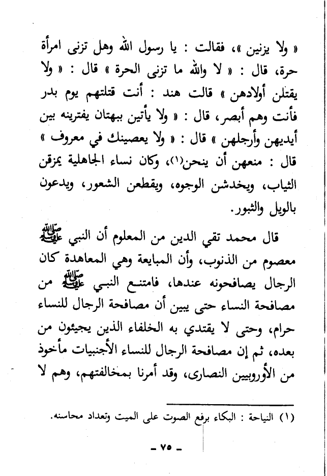 قال محمد تقي الدين من المعلوم أن النبي - صلى الله عليه وسلم - معصوم من الذنوب، وأن المبايعة وهي المعاهدة كان الرجال يصافحونه عندها، فامتنع النبي - صلى الله عليه وسلم - من مصافحة النساء حتى يبين أن مصافحة الرجال للنساء حرام، وحتى لا يقتدي به الخلفاء الذين يجيئون من بعده، ثم إن مصافحة الرجال للنساء الأجنبيات مأخوذ من الأوروبيين النصارى، وقد أمرنا بمخالفتهم، وهم لا