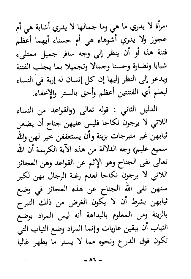 امرأة لا يدري ما هي وما جمالها لا يدرى أشابة هي أم عجوز ولا يدري أشوهاء هي أم حسناء أيهما أعظم فتنة هذا أو أن ينظر إلى وجه سافر جميل ممتلئ شبابا ونضارة وحسنا وجمالا وتجميلا بما يجلب الفتنة ويدعو إلى النظر إليها إن كل إنسان له إربة في النساء ليعلم أي الفتنتين أعظم وأحق بالستر والإخفاء.