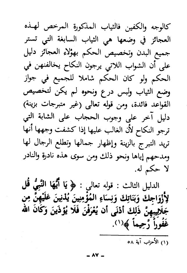 الدليل الثالث: قوله تعالي: {يَا أَيُّهَا النَّبِيُّ قُلْ لِأَزْوَاجِكَ وَبَنَاتِكَ وَنِسَاءِ الْمُؤْمِنِينَ يُدْنِينَ عَلَيْهِنَّ مِنْ جَلَابِيبِهِنَّ ذَلِكَ أَدْنَى أَنْ يُعْرَفْنَ فَلَا يُؤْذَيْنَ وَكَانَ اللَّهُ غَفُورًا رَحِيمًا} [الأحزاب: 59] (¬1) .