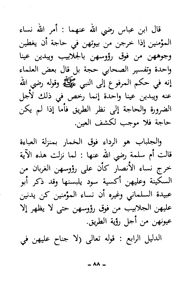 قال ابن عباس رضى الله عنهما: أمر الله نساء المؤمنين إذا خرجن من بيوتهن في حاجة أن يغطين وجوههن من فوق رؤوسهن بالجلابيب ويبدين عينا واحدة.