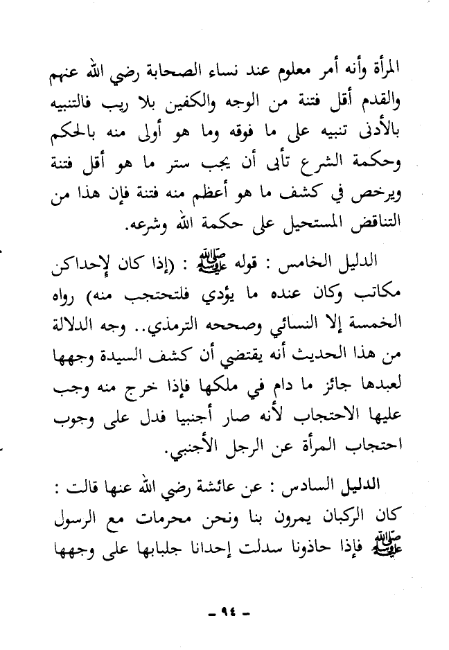 الدليل الخامس: قوله صلى الله عليه وسلم: «إذا كان لِإحداكن مكاتب وكان عنده ما يؤدي فلتحتجب منه» رواه الخمسة إلا النسائي وصححه الترمذي. .