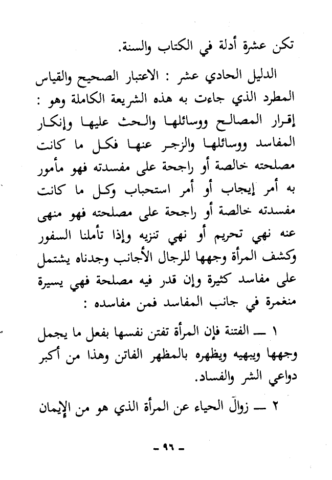 الدليل الحادي عشر: الاعتبار الصحيح والقياس المطرد الذي جاءت به هذه الشريعة الكاملة وهو: إقرار المصالح ووسائلها والحث عليها وإنكار المفاسد ووسائلها والزجر عنها فكل ما كانت مصلحته خالصة أو راجحة على مفسدته فهو مأمور به أمر إيجاب أو أمر استحباب، وكل ما كانت مفسدته خالصة أو راجحة على مصلحته فهو منهي عنه نهي تحريم أو نهي تنزيه، وإذا تأملنا السفور وكشف المرأة وجهها للرجال الأجانب وجدناه يشتمل على مفاسد كثيرة، وإن قدر فيه مصلحة فهي يسيرة منغمرة في جانب المفاسد فمن مفاسده: