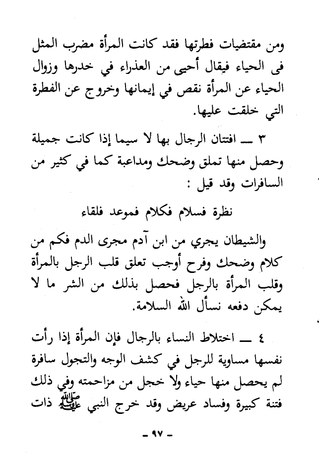 3 - افتتان الرجال بها لا سيما إذا كانت جميلة وحصل منها تملق وضحك ومداعبة كما في كثير من السافرات وقد قيل: