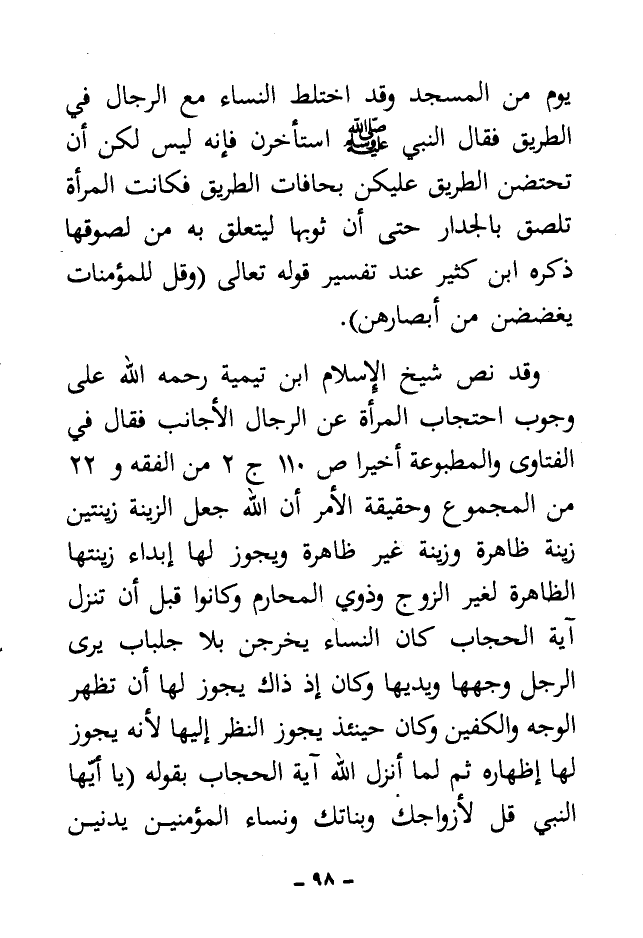 وقد نص شيخ الإسلام ابن تيمية رحمه الله على وجوب احتجاب المرأة عن الرجال الأجانب فقال في الفتاوى والمطبوعة أخيرا ص 110 ج 2 من الفقه و 22 من المجموع وحقيقة الأمر أن الله جعل الزينة زينتين زينة ظاهرة وزينة غير ظاهرة ويجوز لها إبداء زينتها الظاهرة لغير الزوج وذوي المحارم وكانوا قبل أن تنزل آية الحجاب كان النساء يخرجن بلا جلباب يرى الرجل وجهها ويديها، وكان إذ ذاك يجوز لها أن تظهر الوجه والكفين وكان حينئذ يجوز النظر إليها لأنه يجوز لها إظهاره ثم لما أنزل الله آية الحجاب بقوله: {يَا أَيُّهَا النَّبِيُّ قُلْ لِأَزْوَاجِكَ وَبَنَاتِكَ وَنِسَاءِ الْمُؤْمِنِينَ يُدْنِينَ عَلَيْهِنَّ مِنْ جَلَابِيبِهِنَّ} [الأحزاب: 59]