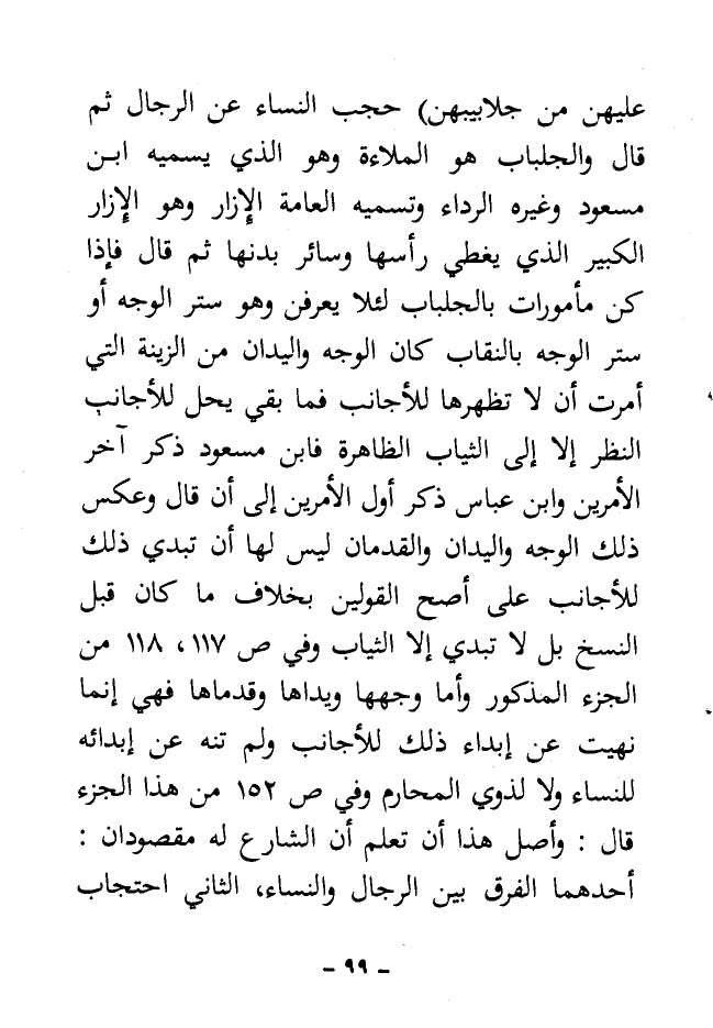 حجب النساء عن الرجال ثم قال: والجلباب هو الملاءة وهو الذي يسميه ابن مسعود وغيره الرداء وتسميه العامة الإزار وهو الإزار الكبير الذي يغطى رأسها وسائر بدنها ثم قال: فإذا كن مأمورات بالجلباب لئلا يعرفن وهو ستر الوجه أو ستر الوجه بالنقاب كان الوجه واليدان من الزينة التي أمرت أن لا تظهرها للأجانب فما بقى يحل للأجانب النظر إلا إلى الثياب الظاهرة فابن مسعود ذكر آخر الأمرين وابن عباس ذكر أول الأمرين إلى أن قال: وعكس ذلك الوجه واليدان والقدمان ليس لها أن تبدي ذلك للأجانب على أصح القولين بخلاف ما كان قبل النسخ بل لا تبدي إلا الثياب وفي ص 117، 118 من الجزء المذكور وأما وجهها ويداها وقدماها فهي إنما نهيت عن إبداء ذلك للأجانب ولم تنه عن إبدائه للنساء ولا لذوي المحارم وفي ص 152 من هذا الجزء قال: وأصل هذا أن تعلم أن الشارع له مقصودان: أحدهما الفرق بين الرجال والنساء، الثاني احتجاب