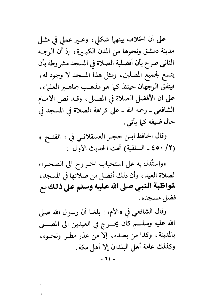 وقال الشافعي في "الأم ": بلغنا أن رسول الله صلى الله عليه وسلم كان يخرج في العيدين إلى المصلى بالمدينة وكذا من بعده إلا من عذر مطر أو نحوه وكذلك عامة أهل البلدان إلا أهل مكة.